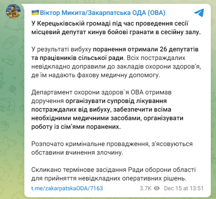 В пятницу, 15 декабря, в полицию поступило сообщение о взрыве гранаты во время заседания сессии в здании Керецковского сельского совета Мукачевского района Закарпатской области. По информации правоохранительных органов, 26 человек пострадали в результате взрыва, из них 6 госпитализированы в тяжелом состоянии.