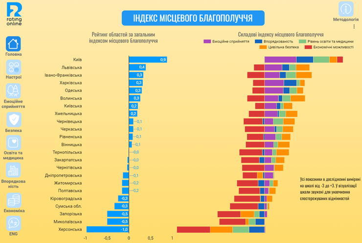ВажноА вот по части безопасности первенство заняли западные области, среди которых: Ивано-Франковская (0.9), Волынская (0.8), Львовская (0.8), Тернопольская (0.7). Здесь Киев занял лишь 13-е место с показателем 0.4, а антилидерами ожидаемо стали Херсонская (-1.3), Запорожская (-0.8), Днепропетровская (-0.3) и Николаевская (-0.2) области.