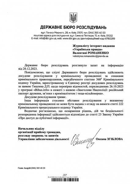 "Сообщаем, что следователи Государственного бюро расследований осуществляют досудебное расследование в уголовном производстве по признакам уголовного преступления, предусмотренного статьей 368-5 Уголовного кодекса Украины, зарегистрированном в Едином реестре досудебных расследований по заявлению Тишлека Д.П. по проверке сведений, обнародованных 26.10.2023 в программе "BihusInfo" в сюжете с названием "Замглавы Нацполиции: российский паспорт жены, связи с криминалитетом и теща-миллионерша", — отметили в Бюро.