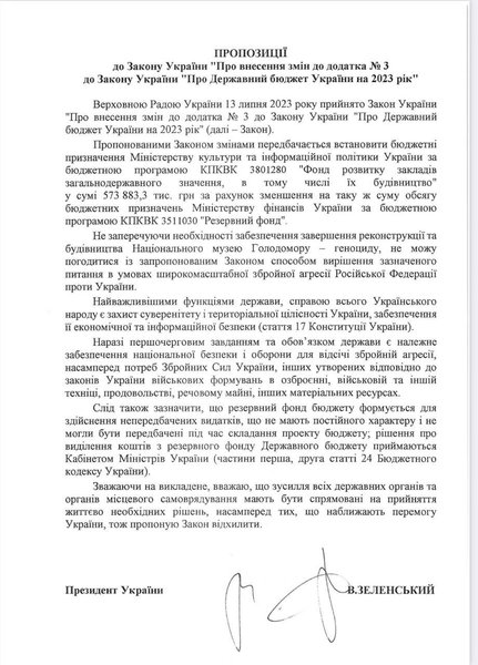 "Считаю, что усилия всех государственных органов и органов местного самоуправления должны быть направлены на принятие жизненно необходимых решений, прежде всего тех, которые приближают победу Украины, поэтому предлагаю закон отклонить", — говорилось в предложении президента.
