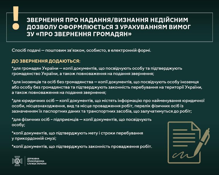 Для получения разрешения необходимо обратиться в соответствующий пограничный отряд ГПСУ. Обращение можно подать лично, по почте или в электронном виде.