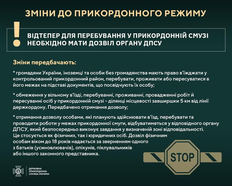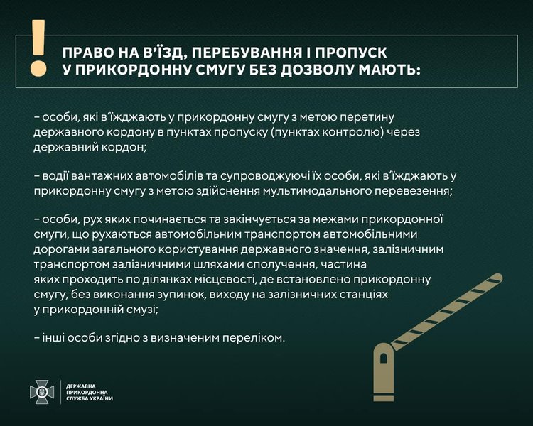 - Для лиц, планирующих въезд, пребывание и выполнение работ в пределах пограничной полосы, необходимо получение разрешения от соответствующего органа Государственной пограничной службы Украины, ответственного за выполнение задач в данной зоне. Это правило применяется как к физическим, так и к юридическим лицам. Разрешение для лиц в возрасте до 18 лет предоставляется по запросу одного из родителей (усыновителей), опекунов, попечителей или другого законного представителя.
