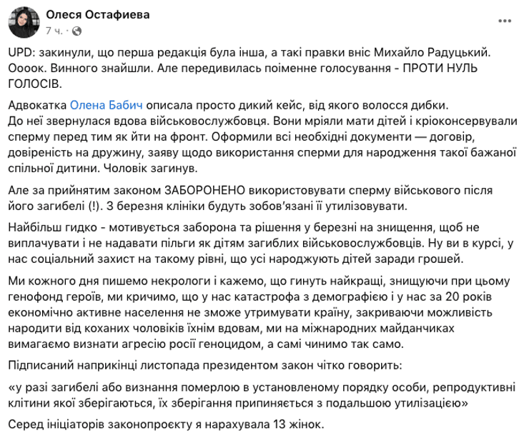 А медийщица Олеся Остафьева на своей странице в Facebook тоже высказалась об этой ситуации. Она пишет, что наиболее противно то, что запрет и уничтожение биоматериала мотивируется тем, чтобы не выплачивать и не предоставлять льготы как детям погибших военнослужащих.