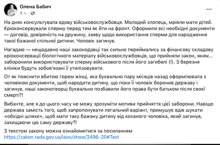 Жены павших воинов бьют тревогу, ведь якобы уже с марта клиники будут обязаны утилизировать замороженную ранее сперму. Так, об этом сообщила в собственном Faceboook адвокат Елена Бабич, рассказывая историю вдовы погибшего военнослужащего.