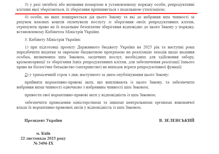 "В случае гибели или признания умершим в установленном порядке лица, репродуктивные клетки которого хранятся, их хранение прекращается с последующей утилизацией", — говорится в пп. 3 п. 2 Переходных положений Закона "О внесении изменений в некоторые законы Украины относительно обеспечения права военнослужащих и других лиц на биологическое отцовство (материнство)".