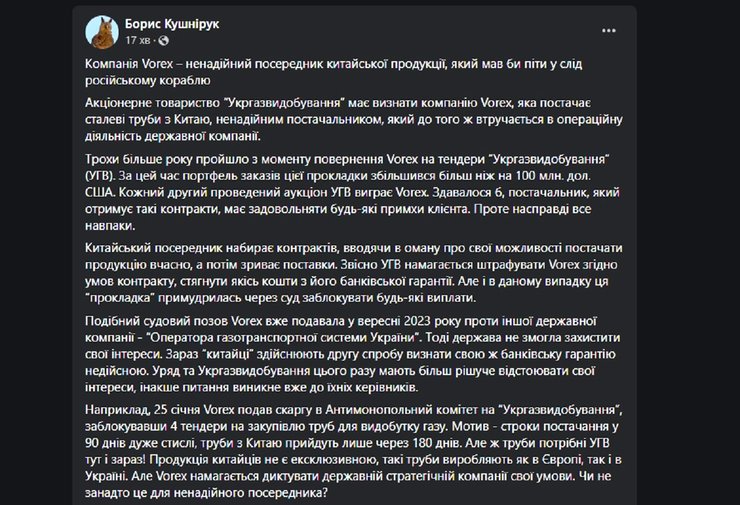Акционерное общество "Укргаздобыча" должно признать компанию Vorex, которая поставляет стальные трубы из Китая, ненадежным поставщиком, который вмешивается в операционную деятельность государственной компании. Об этом заявил экономист Борис Кушнирук в Facebook.