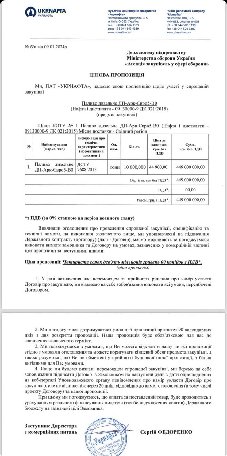 22 декабря Минобороны объявило новый тендер на закупку топлива на 3,4 миллиарда гривен по нулевой ставке НДС, и уже 9 января 2024 года "Укрнафта" предложила его реализацию Министерству обороны также с нулевой ставкой.