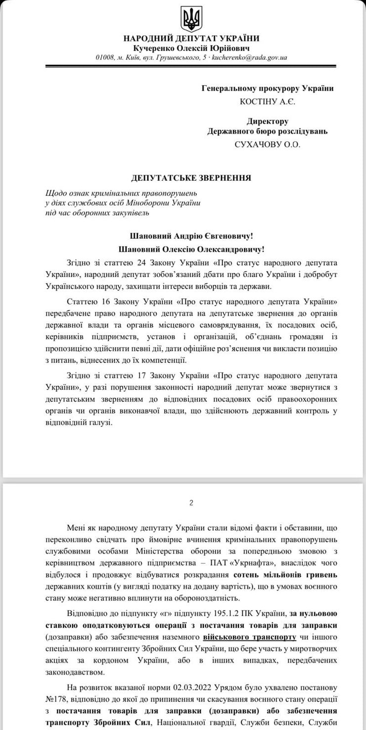 В ноябре Хозяйственный суд г. Киева открыл дело по иску "Укрнафты" к государству в лице Минобороны об обязательстве подписать дополнительные соглашения к уже заключенным договорам поставки нефтепродуктов. Кучеренко обратился в генпрокуратуру, и та вступила в дело 21 декабря, сразу после чего "Укрнафта" отозвала свой иск, заявив в суде ходатайство об оставлении его без рассмотрения.