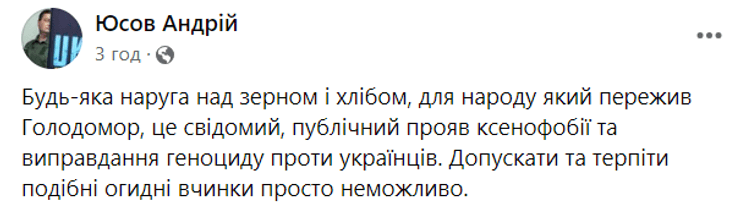 "Любое надругательство над зерном и хлебом, для народа пережившего Голодомор, это сознательное, публичное проявление ксенофобии и оправдание геноцида против украинцев. Допускать и терпеть подобные отвратительные поступки просто невозможно", — написал Юсов на своей Facebook-странице.