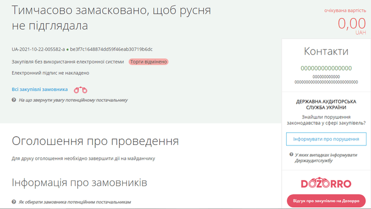 Как утверждает СМИ, Управление капитального строительства Запорожской областной государственной администрации выделило этой закупке надпись: "Временно замаскировано, чтобы р*сня не подглядывала".