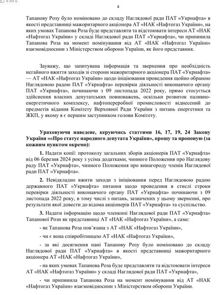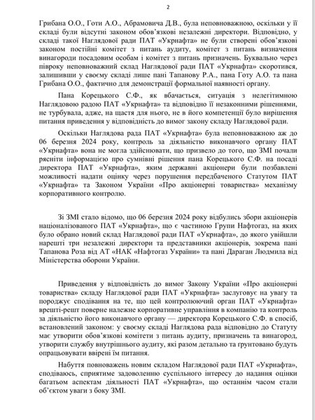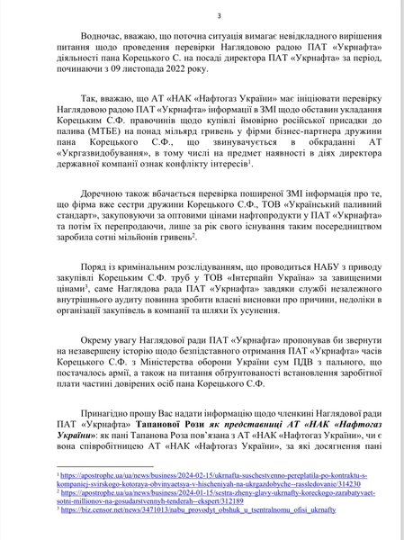 "Наблюдательный совет должен сформировать комитет по вопросам аудита и комитет по назначениям и вознаграждениям, возглавляемые независимыми членами. В компании более года не работает функция внутреннего аудита — это должно наконец измениться. Кроме того, наблюдательный совет должен дать надлежащую оценку очевидным конфликтам интересов на уровне руководителя компании. Прежде всего речь о треугольнике "Укрнафта", "УЗ" и "Идеалист", а также о основанном на родственных связях сотрудничестве между "Укрнафтой" и ООО "Украинский топливный стандарт"", - пишет нардеп.