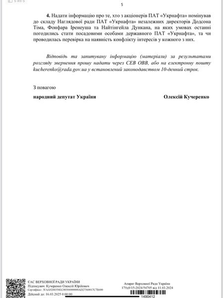 Также, по его словам, Наблюдательному Совету стоит оценить необходимость пребывания на руководящих должностях "Укрнафты" экс-чиновников, к которым есть вопросы у антикоррупционных органов. В качестве примера он приводит бывшего заместителя председателя ФГИУ Дениса Кудина, который сейчас является вице-президентом по вопросам стратегии и развития компании.