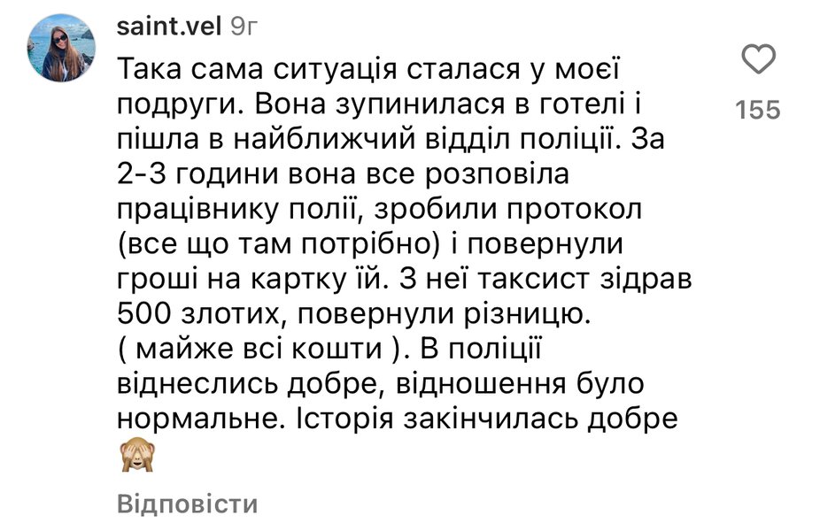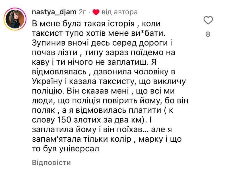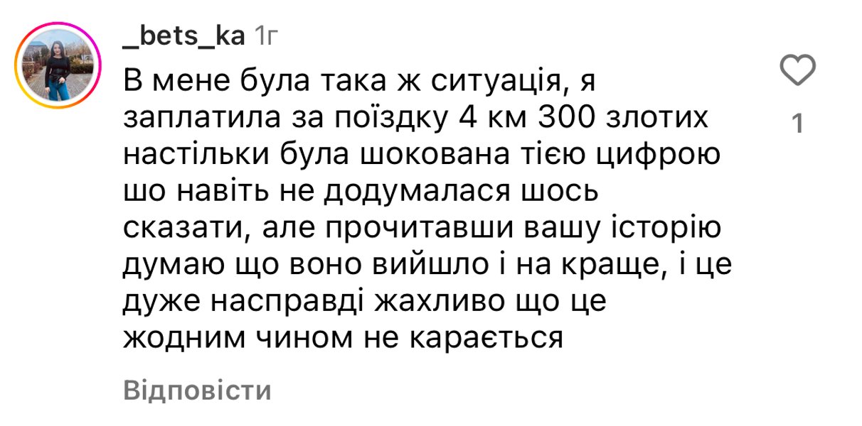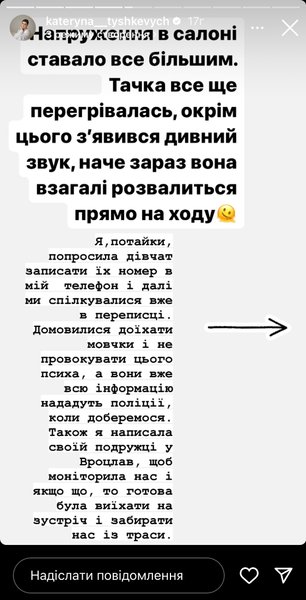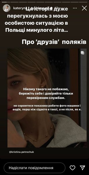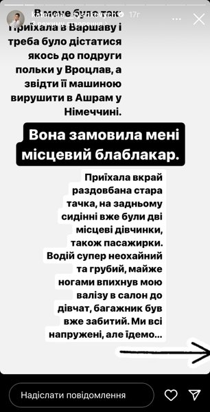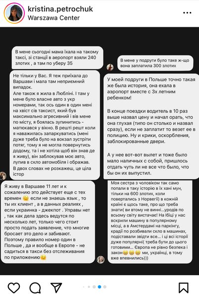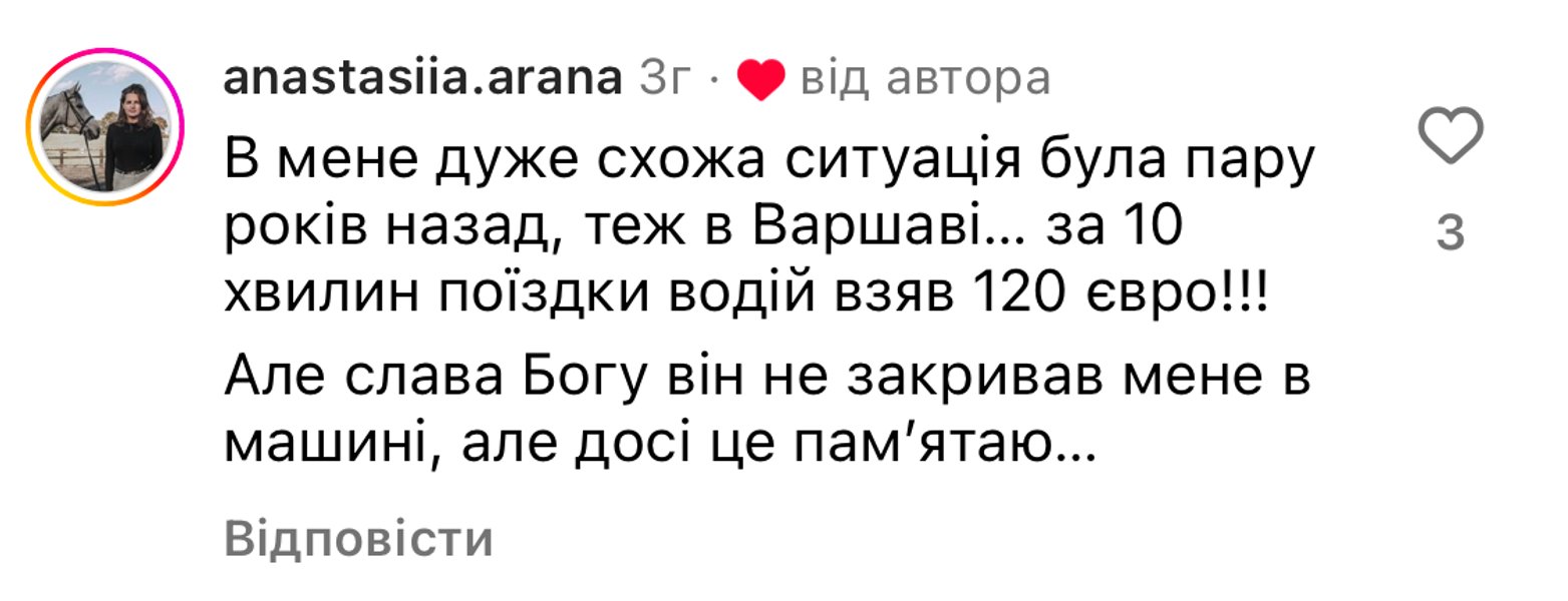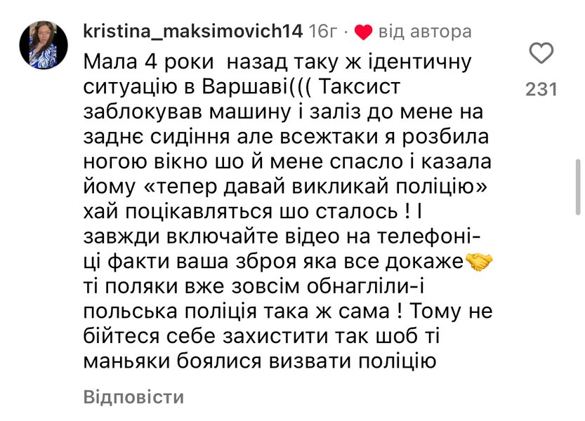 Украинская актриса Екатерина Тышкевич распространила публикацию Петрочук и поделилась собственной историей из Польши. Она рассказала, что приехала в Варшаву и должна была доехать к подруге во Вроцлав "местным BlaBlaCar".