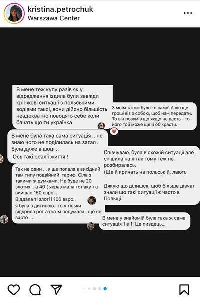 Девушка прикрепила скриншоты более десятка сообщений от украинок, которые сами оказались или слышали о подобных ситуациях. В комментариях женщины также делятся похожими случаями, которые произошли с ними в Польше.