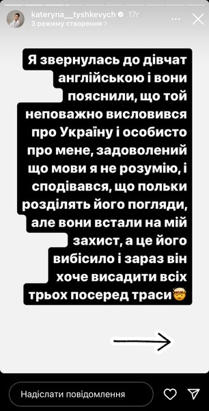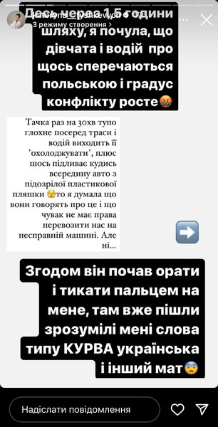 "Я обратилась к девушкам на английском, и они объяснили, что тот неуважительно высказался об Украине и лично обо мне. Довольный, что языка я не понимаю, он надеялся, что польки разделят его взгляды. Но они встали на мою защиту, а это его выбесило и сейчас он хочет высадить всех троих посреди трассы", — рассказала актриса.