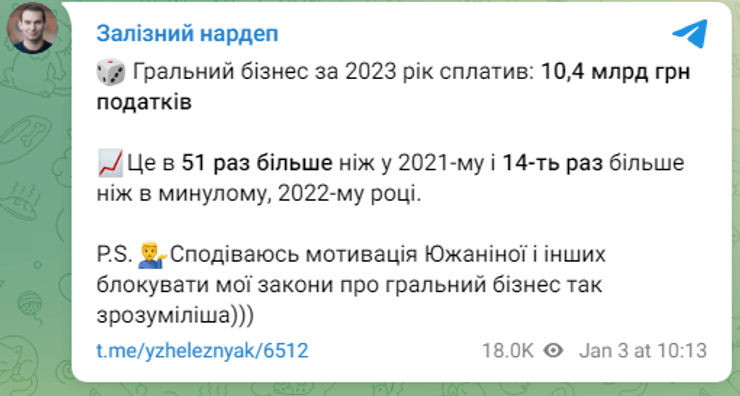 По данным первого заместителя руководителя комитета Верховной Рады по финансам, налоговой и таможенной политике Ярослава Железняка, игорный бизнес за 2023 год уплатил более 10 млрд грн налогов. В то же время общий оборот игорного бизнеса вырос почти в 15 раз в год и достиг 207 млрд грн.