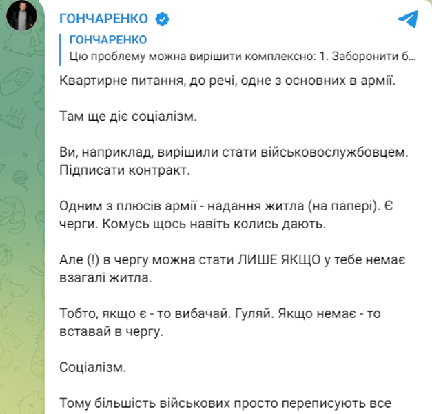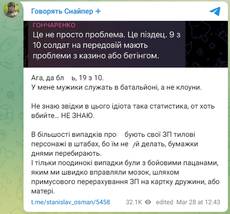 "Из 10 солдат на передовой имеют проблемы с казино или беттингом. Деньги проигрываются. Потом берут кредиты. И так по кругу. Это проблема которая ПРЯМО СЕЙЧАС уничтожает моральное состояние военных. Но кроме этого она создает проблему и на ПОТОМ", — пишет Гончаренко.
