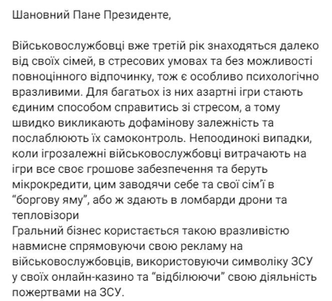 Петриченко считает, что игорный бизнес "пользуется такой уязвимостью умышленно направляя свою рекламу на военнослужащих". При этом, по его словам, в рекламе используется символика ВСУ, а сами онлайн-казино и "отбеливают" свою деятельность пожертвованиями на ВСУ.