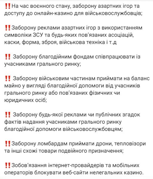 - Запрет использования символики ВСУ в рекламе азартных игр.