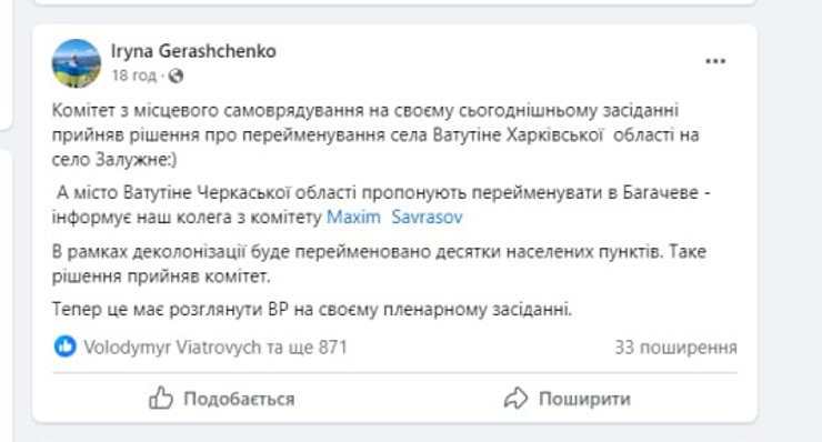 "Комитет по местному самоуправлению принял решение о переименовании села Ватутино Харьковской области в село Залужное. А город Ватутино Черкасской области предлагают переименовать в Багачево. В рамках деколонизации будут переименованы десятки населенных пунктов. Теперь это должна рассмотреть Верховная Рада на своем пленарном заседании", — сообщила депутат.