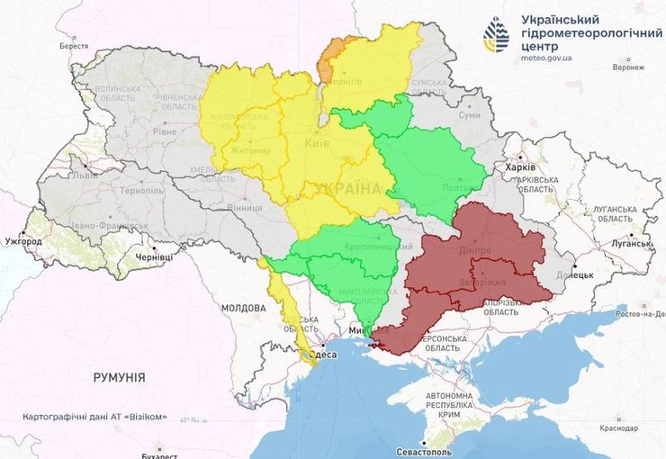 - из-за опустошения Каховского водохранилища и вхождения реки Днепр в старое естественное русло уровни воды значительно ниже отметок водозаборов в Днепропетровской, Запорожской, Херсонской областях (III уровень опасности — коричневый).