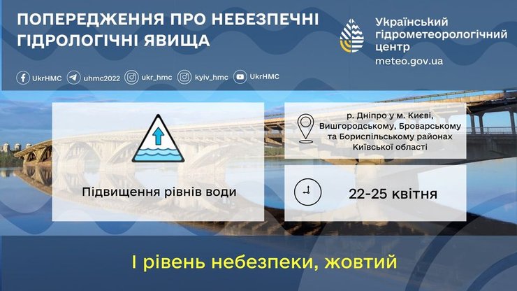 - на отдельных участках рек в Житомирской, Киевской и Черкасской областях возможно начальное затопление пойм (І уровень опасности — желтый). В местах выпадения интенсивных дождей возможно формирование значительного местного стока.