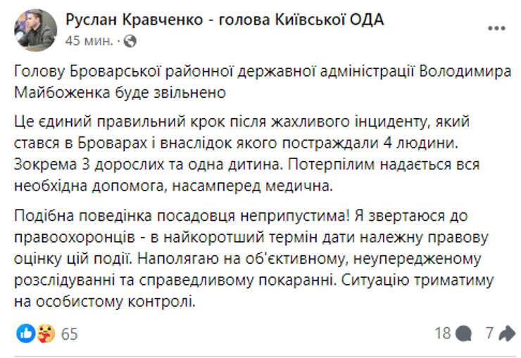 "Председатель Броварской районной государственной администрации Владимир Майбоженко будет уволен. Это единственный правильный шаг после ужасного инцидента, который произошел в Броварах и в результате которого пострадали 4 человека. В частности 3 взрослых и один ребенок", — сообщил Кравченко.