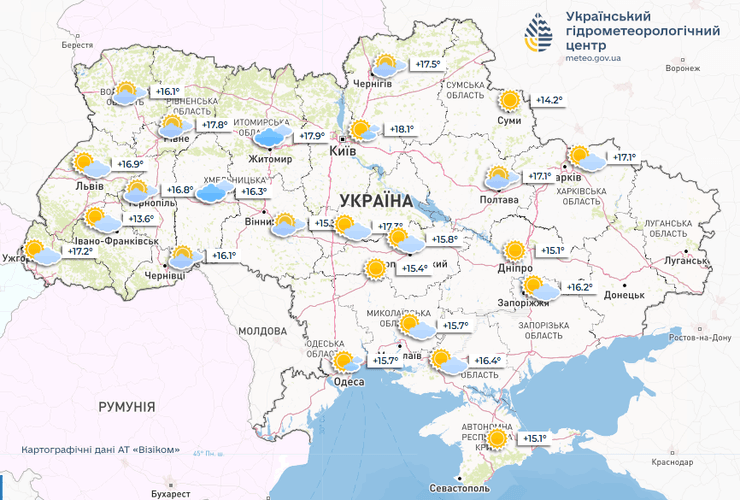 Ветер преимущественно юго-западный, 7-12 м/с, днем в западных и северных областях местами порывы 15-18 м/с. Температура ночью +8-13°; днем +20-25°, в Карпатах и на побережье морей +14-19°.
