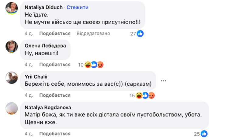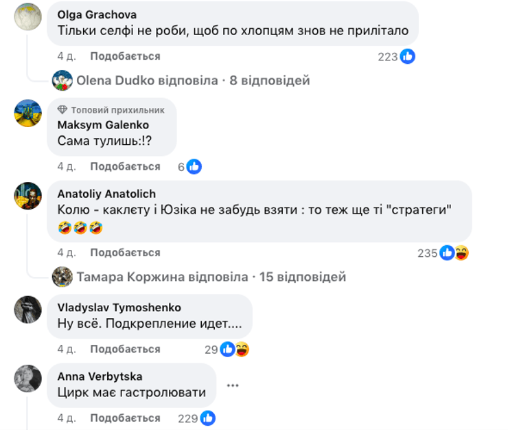 "Стальным несокрушимым катком и мощным огневым валом едет уничтожать коварного противника Марьяна Безуглая на всех фронтах, территориях и направлениях без сожаления и никаких шансов для спасения", — написал под сообщением пользователь Yevgen Seredenko.