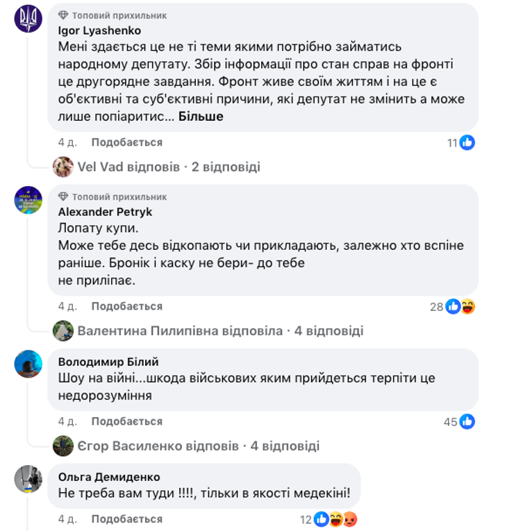 Ей также посоветовали взять с собой лопату, чтобы не словом, а делом помочь со строительством укреплений. Другие пользователи попросили депутата по возможности больше в Верховную Раду не возвращаться.