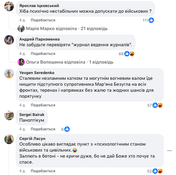 Украинцы анонсированную депутатом "инспекцию" восприняли с юмором и скепсисом. В комментариях под сообщением пользователи выразили сомнения, входит ли такая проверка в компетенцию народного депутата, а также не представляет ли опасности для военных "психическое состояние" Безуглой?
