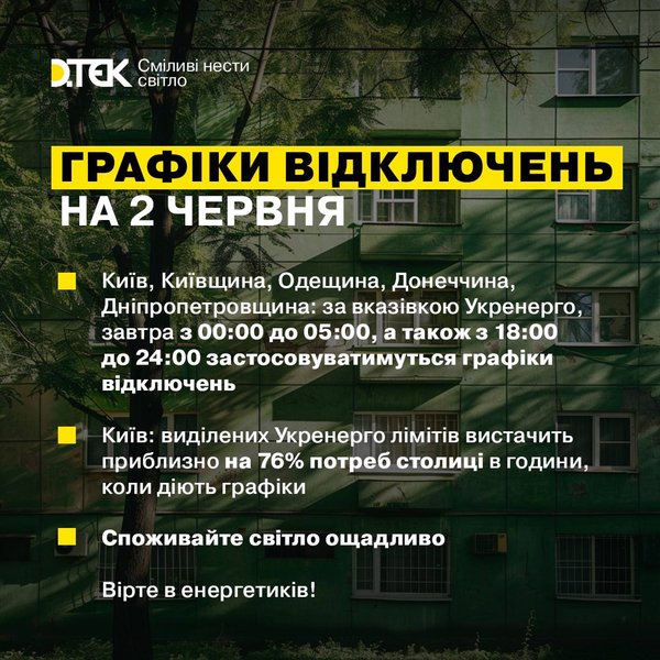 Позже в ДТЭК уточнили, что Днепропетровская область должна пройти 3 июня без отключений электричества.