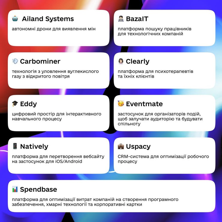 Победителями конкурса стали стартапы, которые разрабатывают дрона-искателя мин, оптимизируют рабочий процесс, превращают сайт в приложение для мобильных телефонов, создают специализированную платформу для психотерапевтов и их клиентов и тому подобное.