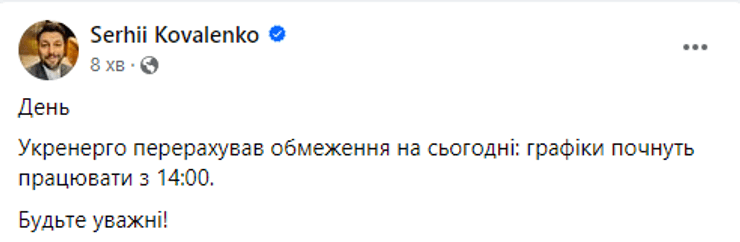 Он сообщил, что "Укрэнерго" пересчитал ограничения на пятницу и в результате чего графики отключения электроэнергии начнут работать уже с 14 часов.