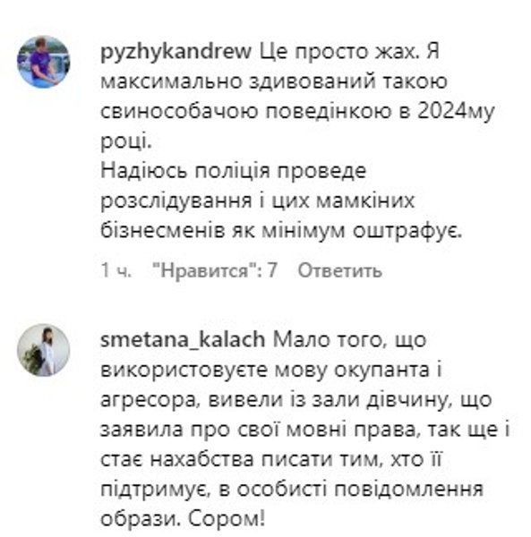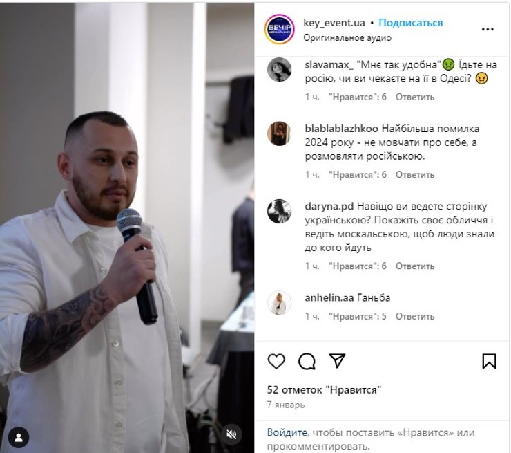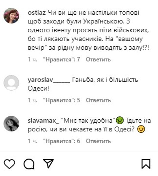 Между тем в адрес организаторов посыпались в Instagram гневные комментарии. В числе претензий — нарушение языкового закона. Пользователи посоветовали в дальнейшем проводить свои ивенты в России, если они не хотят соблюдать украинские законы.