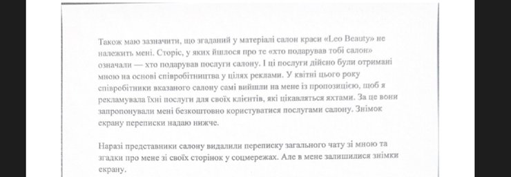 Салон красоты "Leo Beauty", о котором шла речь в расследовании, ей не принадлежит. Сторис, в которых говорилось "кто подарил тебе салон" означали, по ее словам: "кто подарил услуги салона". Эти услуги были получены на основе сотрудничества в целях рекламы. В апреле сотрудники салона вышли на неё с предложением, чтобы она рекламировала их услуги, а за это предложили бесплатно пользоваться услугами салона.