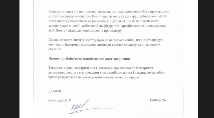 Представители салона удалили переписку чата, упоминания об Ильницкой в соцсетях. Предложение она называет провокацией со стороны владельцев салона Leo Beauty против нее и Вербицкого, ведь после начала кампании дезинформации он узнал, что владельцами салона красоты являются лица, аффилированные с фигуранткой уголовного производства, которой он подписал уведомление о подозрении.
