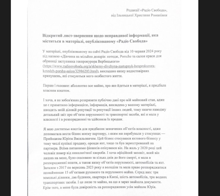 В материале СМИ о семье заместителя генпрокурора Вербицкого, изложен ряд недостоверных предположений, касающихся жизни названных лиц. Об этом говорится в письме-обращении Кристины Ильницкой к СМИ, передает "Апостроф".