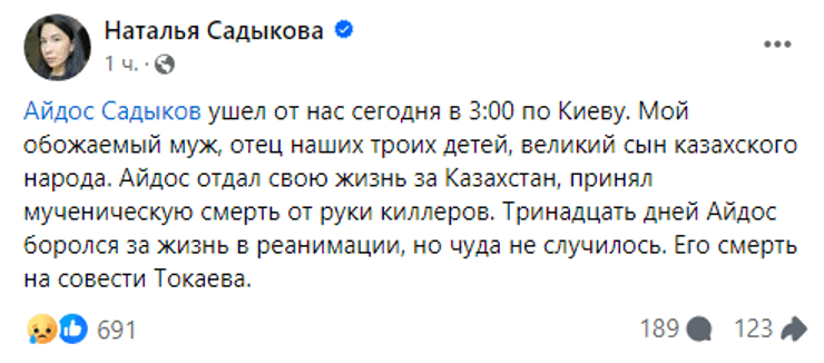 "Айдос Садыков ушел от нас сегодня в 3:00 по Киеву. Мой обожаемый муж, отец наших троих детей, великий сын казахского народа. Айдос отдал свою жизнь за Казахстан, принял мученическую смерть от руки киллеров", — написала супруга оппозиционера.