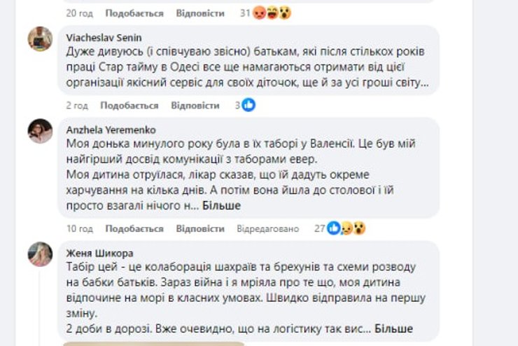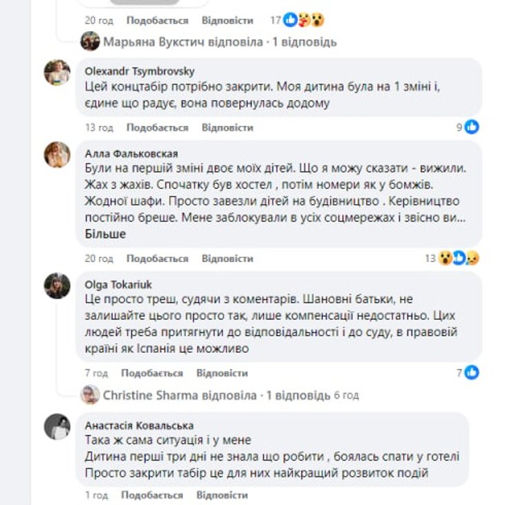 "Лагерь этот — это коллаборация мошенников и лжецов и схемы развода на бабки родителей. Привезли утром и до 22.00 ребенка моего не расселили. Ребенок не был 3 суток в душе. Вместо 3 детей — 6 в комнате. Еда сомнительная. Картошка 3-х видов, макароны — 3 видов. Про морепродукты в испанской кухне — дети не слышали совсем, хотя в последний день на весь лагерь приготовили по одной креветочке. Так это почти за 2000 евро. Условия проживания — у скота в украинских хозяйствах лучше. Муравьи, антисанитария — потому что клининга нет" — написала Евгения Шикора.