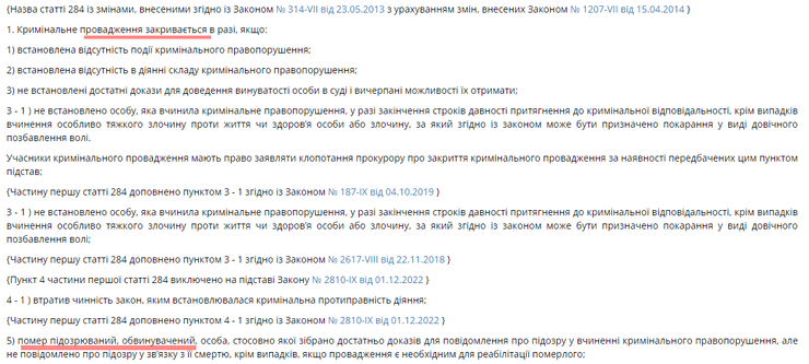 В то же время, как отмечают в издании, согласно действующему законодательству, статья 284 УПК Украины предусматривает основания для закрытия уголовного производства, среди которых и смерть подозреваемого, обвиняемого или лица, в отношении которого собрано достаточно доказательств для сообщения о подозрении в совершении уголовного преступления, но не сообщено в связи с его смертью.