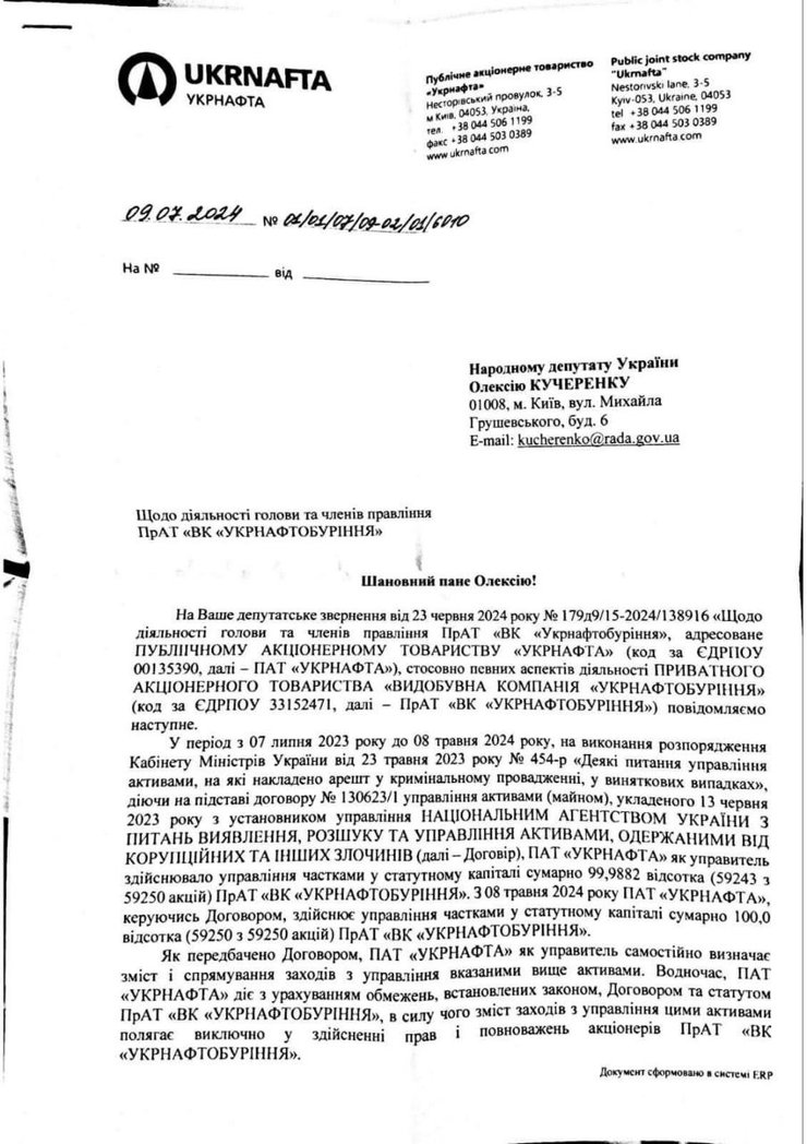 Нардеп отметил, что на днях получил ответ от "Укрнафты" на его обращение, в котором ставил несколько простых вопросов как к управляющему УНБ. В частности, Кучеренко спрашивал: