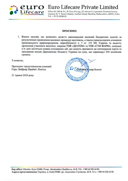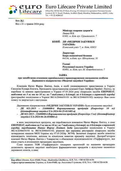 "Принципы осуществления публичных закупок — "максимальная экономия, эффективность и пропорциональность" — сейчас, как никогда, очень актуальны для нашего государства, особенно в период военного положения, полномасштабного вторжения РФ. В то время, когда все государственные предприятия, учреждения организации направляют свои силы на максимальную экономию для поддержки экономики нашей страны и военных, защищающих наше государство, закупка крайне необходимых фармацевтических продуктов должна происходить открыто и прозрачно на всех стадиях закупок и с максимальной экономией бюджетных средств", — говорится в письме.