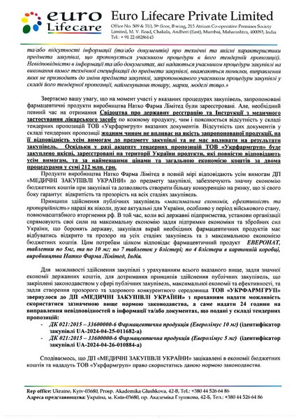 В письме также отмечается, что на момент подачи тендерных предложений продукция Натко Фарма Лимитед прошла все необходимые проверки и была зарегистрирована.