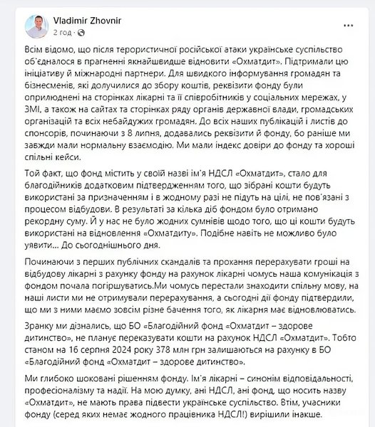 Владимир Жовнир заявил, что теперь публично требует от фонда перевести средства, полученные на все банковские и финансовые счета БФ "Охматдет — здоровое детство" в виде благотворительной помощи для восстановления разрушенных зданий и материально-технической базы НДСБ "Охматдет" МЗ Украины после ракетной атаки 8 августа 2024 года на казначейский счет НДСБ "Охматдет".