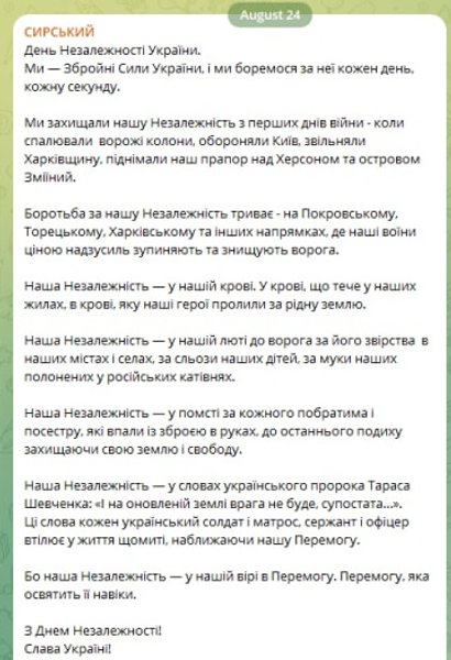 "Мы защищали нашу Независимость с первых дней войны — когда сжигали вражеские колонны, обороняли Киев, освобождали Харьковскую область, поднимали наш флаг над Херсоном и островом Змеиный. Борьба за нашу Независимость продолжается — на Покровском, Торецком, Харьковском и других направлениях, где наши воины ценой сверхусилий останавливают и уничтожают врага. Наша Независимость — в нашей крови, в нашей ярости к врагу за его зверства в наших городах и селах, за слезы наших детей, за муки наших пленных в российских застенках, в мести за каждого собрата и сестру, которые упали с оружием в руках, до последнего вздоха защищая свою землю и свободу", — написал он.