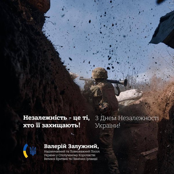 Экс-главнокомандующий ВСУ, а ныне посол Украины в Великобритании Валерий Залужный был очень лаконичным в поздравлении Украины с Днем независимости.