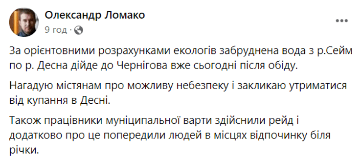 "По ориентировочным расчетам экологов загрязненная вода из реки Сейм по реке Десна дойдет до Чернигова уже сегодня после обеда", — написал он.