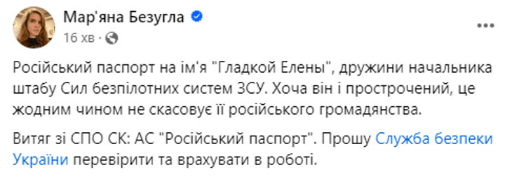 В сети появились копии якобы российского паспорта Елены Гладкой — жены начальника штаба Сил беспилотных систем ВСУ Романа Гладкого. Документы на своей странице в Facebook выложила народный депутат Марьяна Безуглая.