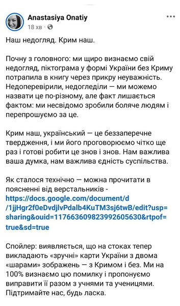 "Наше упущение. Мы искренне признаем свой недосмотр, пиктограмма в форме Украины без Крыма попала в книгу из-за досадной невнимательности. Недопроверили, недосмотрели — мы можем назвать это по-разному, но факт остается фактом: мы неосознанно сделали больно людям и приносим извинения за это. Крым наш, украинский — это неоспоримое утверждение, и мы его проговариваем четко еще раз и готовы делать это снова и снова. Нам важно ваше мнение, нам важно единство общества. Мы предлагаем запустить флешмоб "Дорисуй Крым", — написала автор учебника.